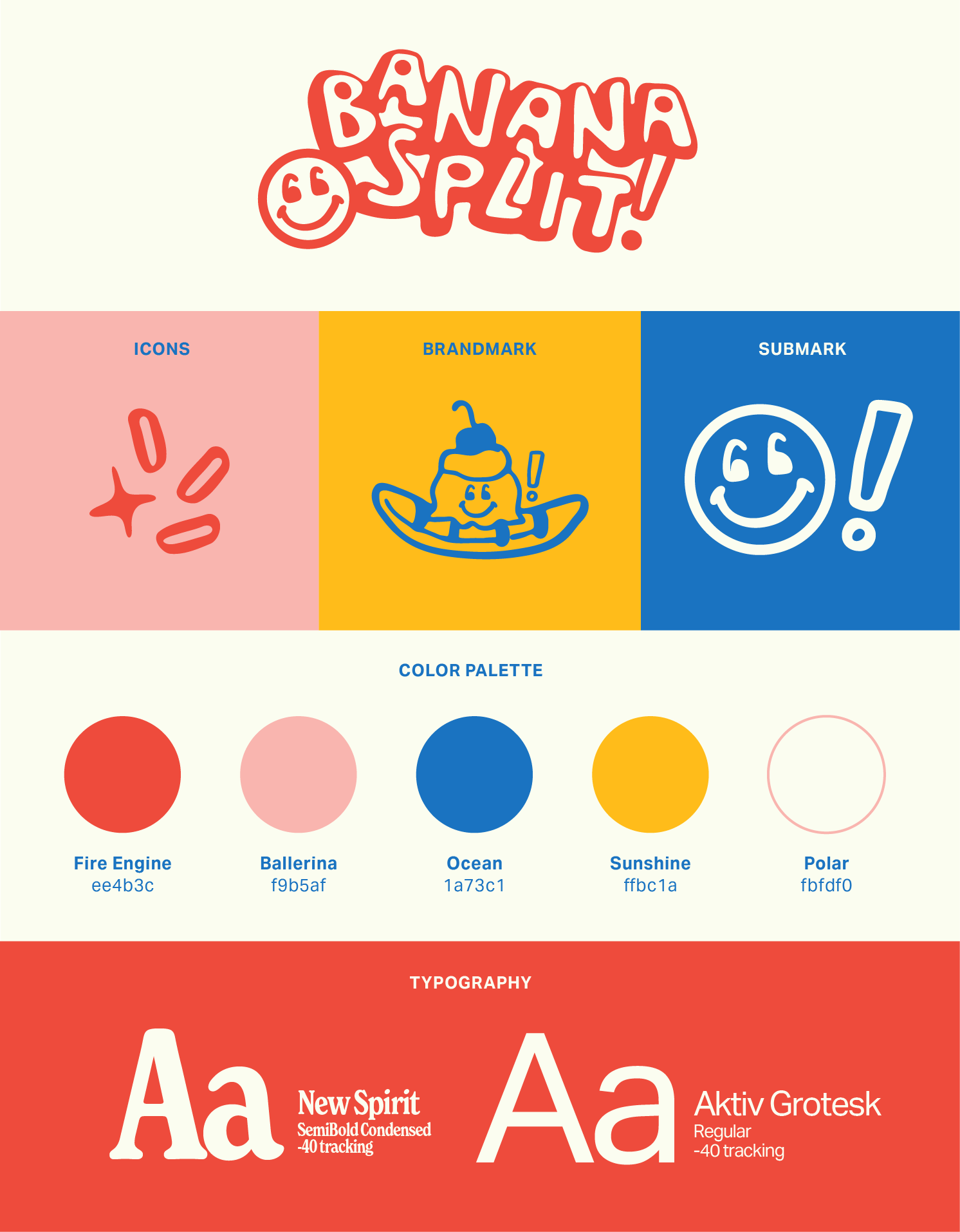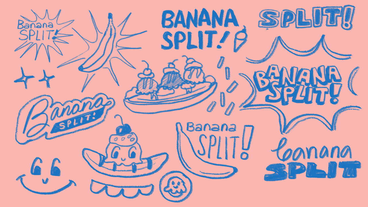 Logo + branding for a fictional ice cream shop called "Banana Split." The desired look is colorful, retro, and illustrated.